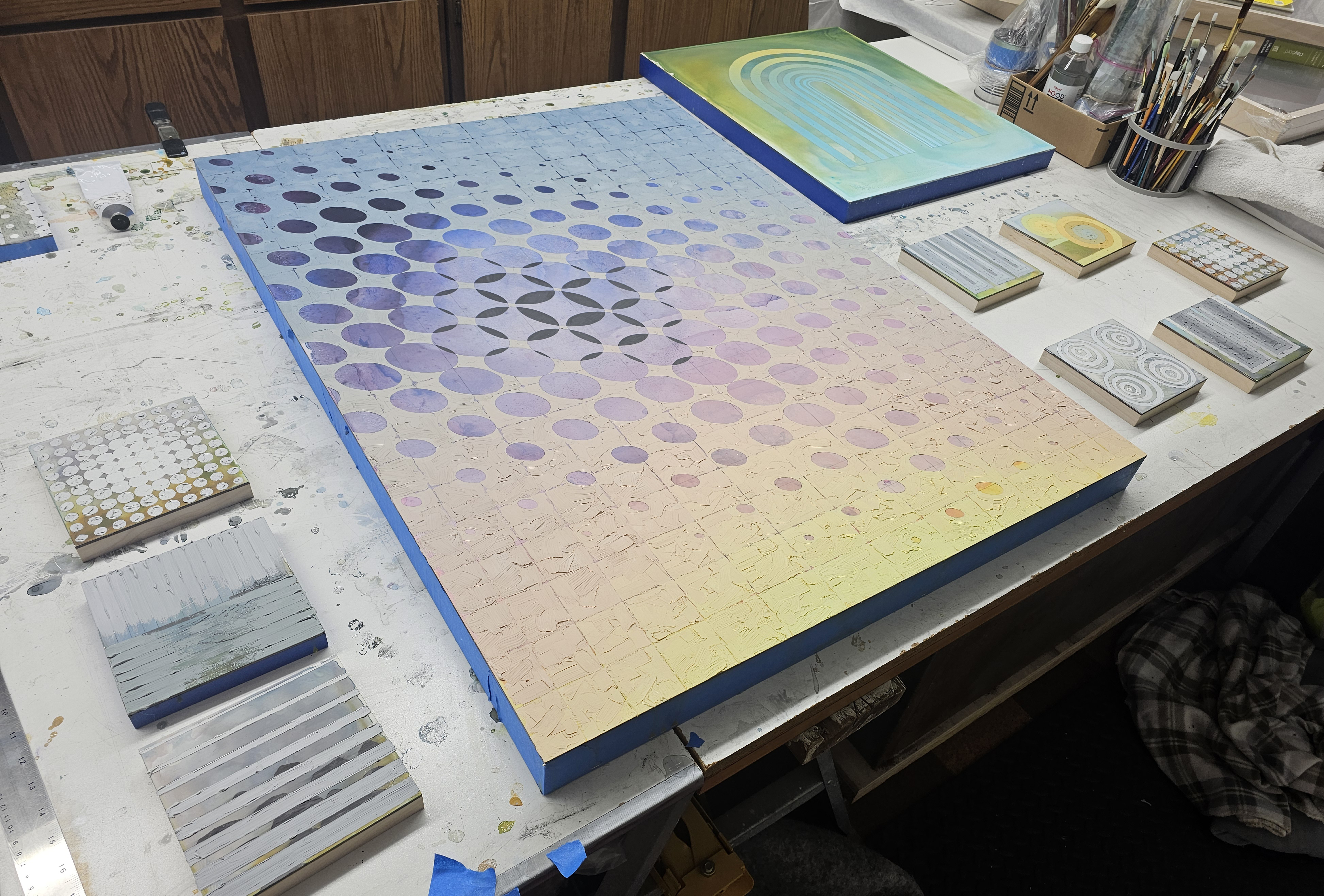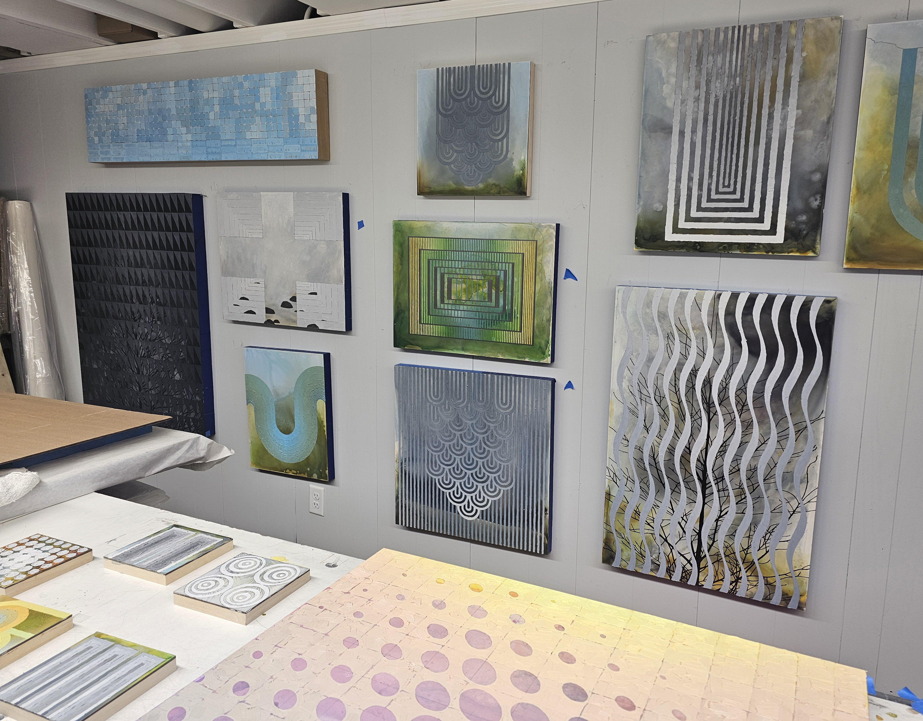 As installation day approaches, my focus has shifted to the less glamorous (but deeply satisfying, sometimes nerve-wracking) final tasks: varnishing surfaces, attaching picture-hanging hardware, and tying up loose ends so the work is ready to leave the studio. Preparing for a solo show always sharpens how pieces speak to one another, and works made months apart are now clearly in conversation—about light, atmosphere, and transition.