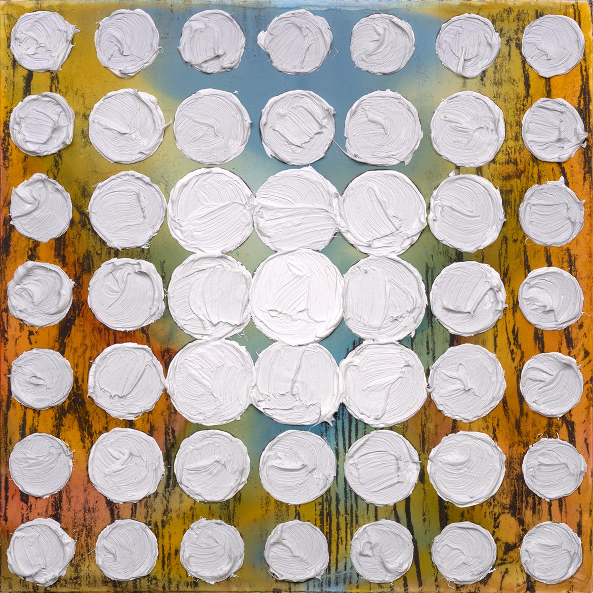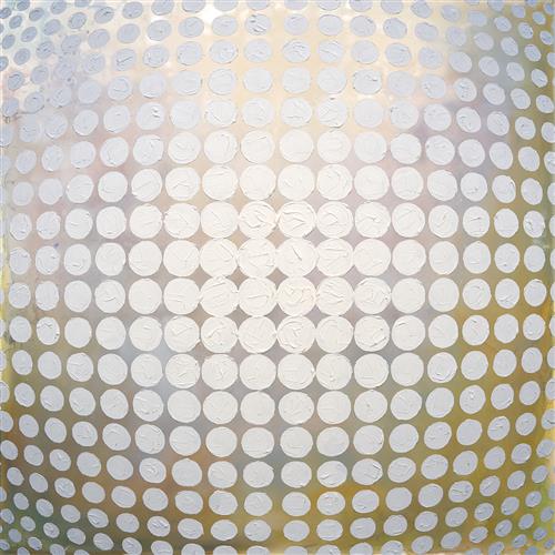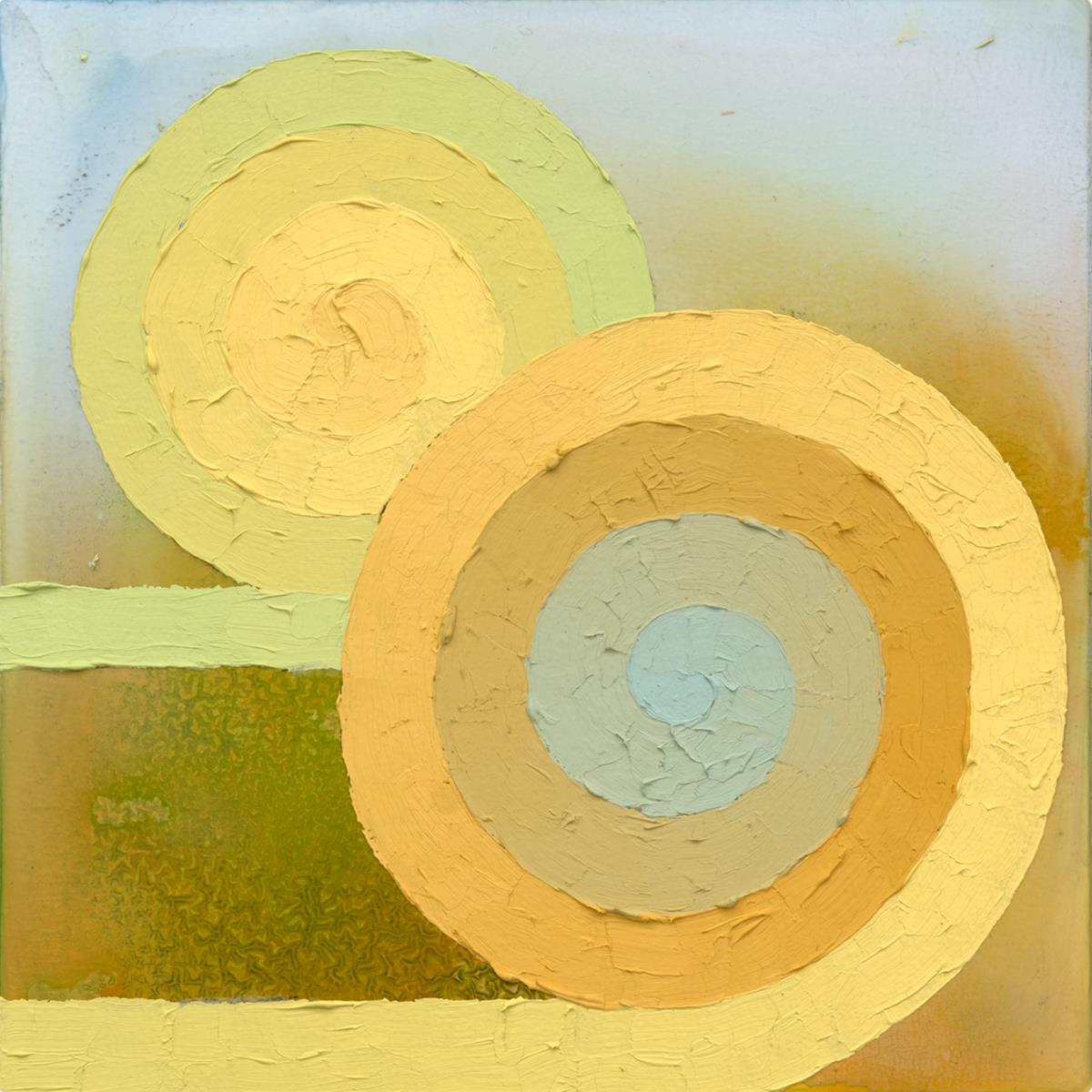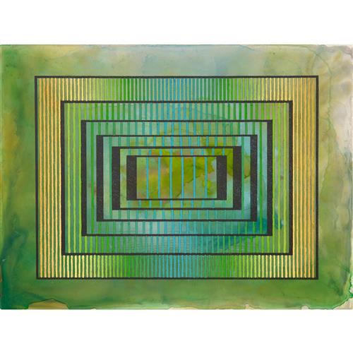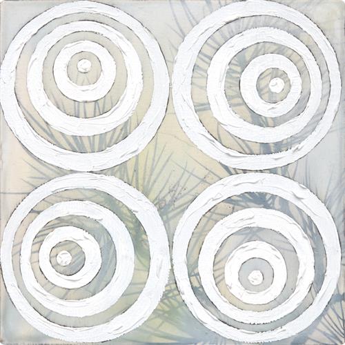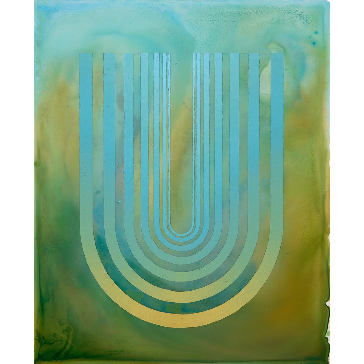 Each work begins with close observation. Walking through open terrain, tracking weather shifts, and watching how sunlight moves across surfaces form the foundation of Gates’s practice. Her paintings do not aim for literal representation; instead, they distill the qualities that define a particular moment—the stillness before a storm, the sound of rainfall moving through foliage, or the gradual recalibration of color as day progresses. Geometry plays a central role in this translation. Circles, grids, and measured lines operate not as ornament but as structuring devices that introduce rhythm, spatial balance, and internal logic. These visual systems amplify environmental forces, allowing each painting to function as a layered, animated field.